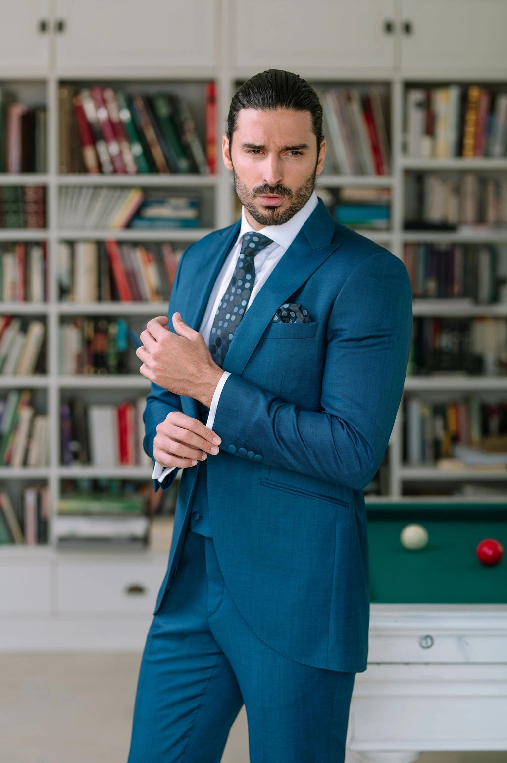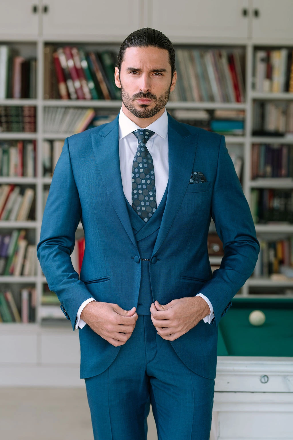 El modelo ZELIE representa una visión contemporánea del clásico traje de novio azul. Su diseño transmite serenidad, confianza y elegancia atemporal. Perfecto para novios que desean proyectar personalidad sin perder sobriedad.